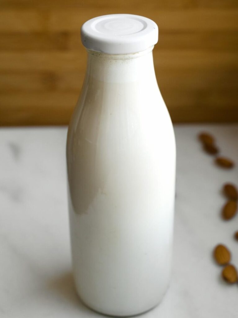 - Over a large bowl, filter the almond milk through a nut milk bag. Squeeze out all the liquid. Transfer the milk to a jar or container with a cover. Voila. Almond milk.