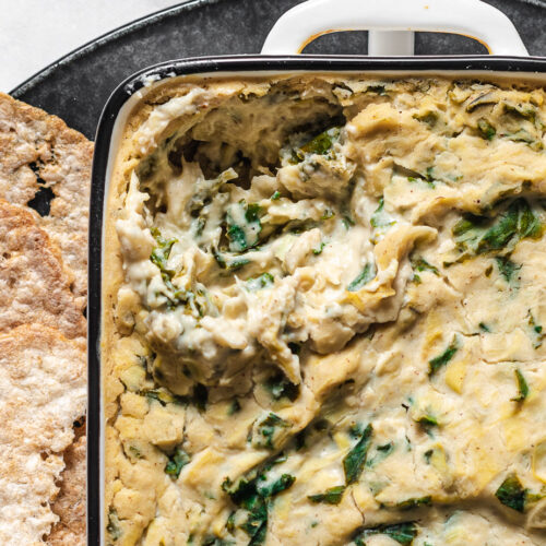 This is a creamy baked kale and artichoke dip perfect for serving as a snack or appetizer. It's oil-free and gluten-free with a nut-free option.