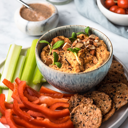 I also like to get a little cray with my hummus. My latest version is an oil-free Roasted Carrot Hummus with a little kick and a lotttt of flavor.