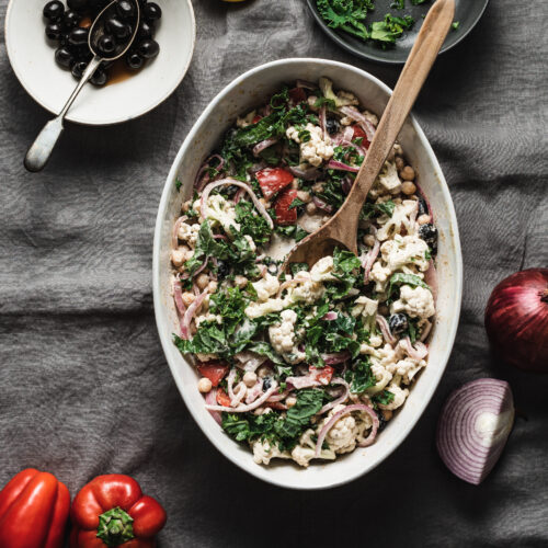 The inspo for this Mediterranean cauliflower casserole was the weeknight tempeh casserole from The Plant-Based Cookbook. I’ve received so many love letters (emails) about this recipe and I love it too! We usually have it twice a month, which is a big deal considering I struggle to cook the same thing twice (always in creator mode). I took the method of that recipe and applied it to different whole foods and another flavor profile. I have many more iterations in the works.