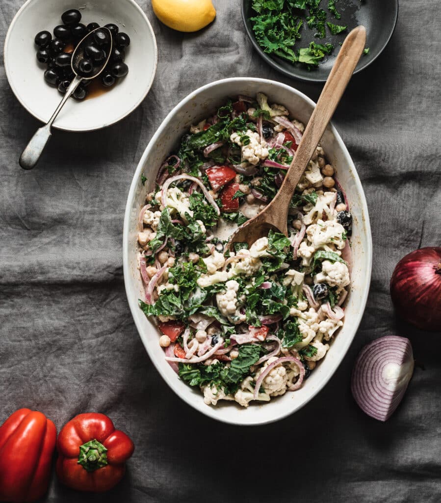 The inspo for this Mediterranean cauliflower casserole was the weeknight tempeh casserole from The Plant-Based Cookbook. I’ve received so many love letters (emails) about this recipe and I love it too! We usually have it twice a month, which is a big deal considering I struggle to cook the same thing twice (always in creator mode). I took the method of that recipe and applied it to different whole foods and another flavor profile. I have many more iterations in the works.