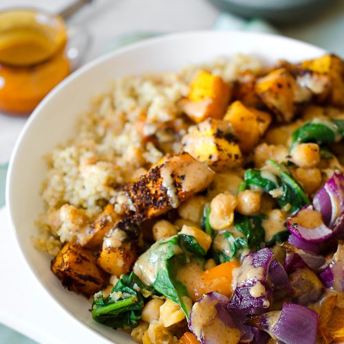 Warm Roasted Squash and Quinoa Bowls with Almond Citrus Sauce (what a delicious mouthful, literally).