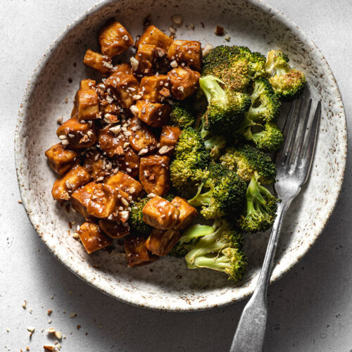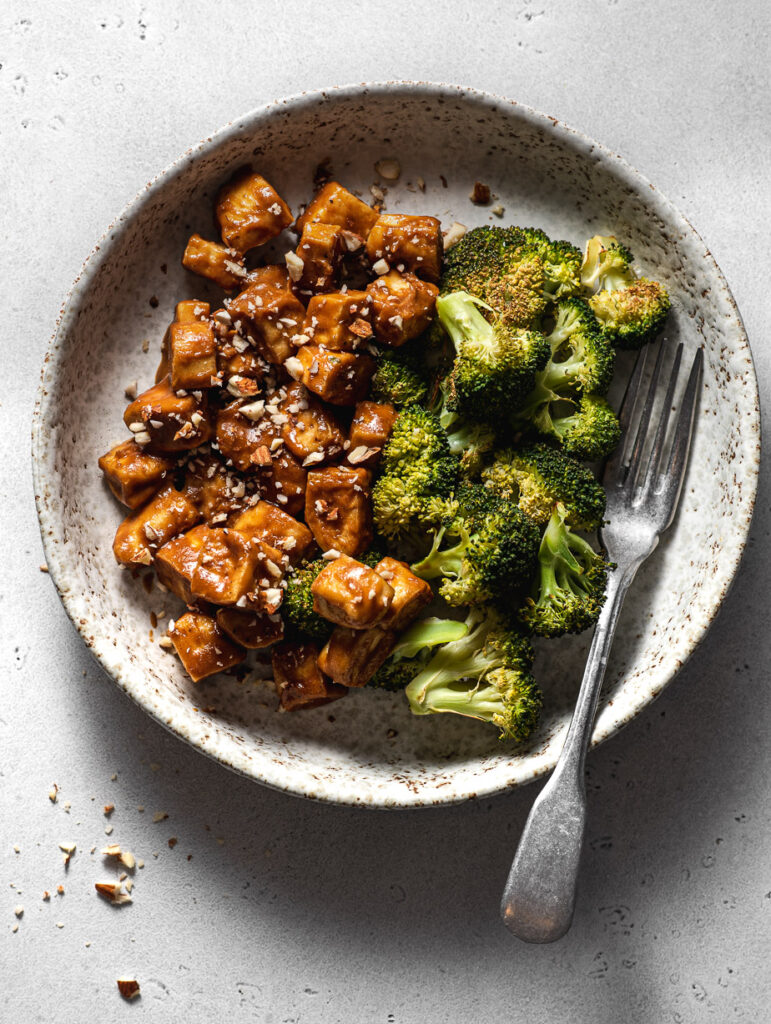 - When cooked, transfer the tofu to a large bowl and toss with the sauce. I like to add about half the sauce and toss and then keep adding until all the tofu is covered. Or I'll save the other half and drizzle it on the broccoli or save for later.Divide the saucy tofu and broccoli among plates and garnish with chopped nuts or seeds. If I use tahini in the sauce, I’ll use sesame seeds or if I use almond butter I'll use chopped almonds.