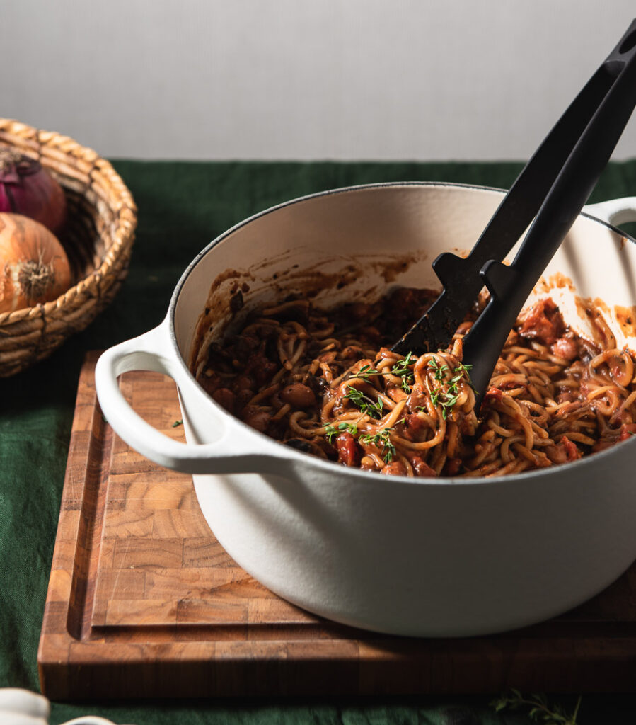 OMG you bet! You start with leeks (or onions), garlic, and mushrooms. This builds deep, delicious flavour. You also add spices and cheesy nutritional yeast along with some canned tomatoes and creamy beans. Toss in the pasta and simmer. When it’s done you have a thick and fragrant sauce with perfectly cooked pasta. Ya-umm!
