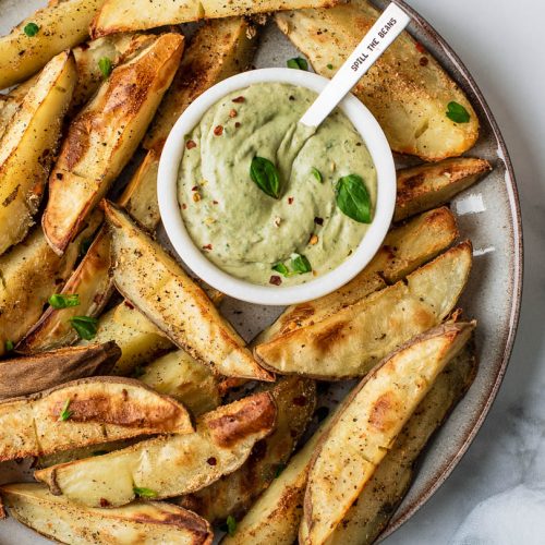 So skip the commercial mayo and dip these crispy plant-based potato wedges into a hummus or cashew based mayo (or mayo hummus hybrid for sure!).