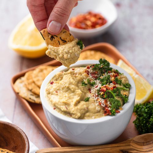 Here’s another plant-based tip from my kitchen to yours (even though I’m currently in Japan!), a lick-the-bowl it’s so good, oil-free curry hummus and my new favorite cracker! I take crackers very seriously.