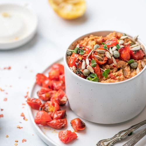 Type of Hummus? I would call this the ultimate party hummus! Garnished with roasted tomatoes and sunflower seeds, it’s pretty but it’s also intense in flavor.