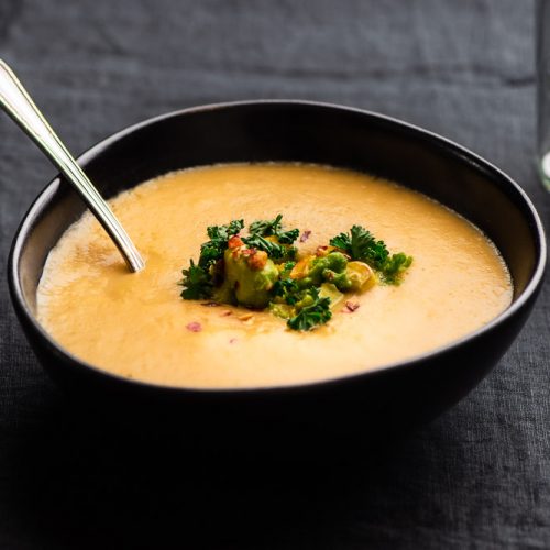 • Add the nutritional yeast, lime juice, tamari, salt, and a pinch of black pepper to the blender with the corn and carefully add the soup as well. Do this in stages if needed.