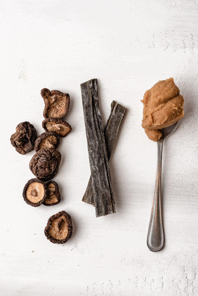 You don’t need any special equipment but there are a couple of ingredients you might want to get familiar with: shitake, kombu, miso. Shown left to right below.
