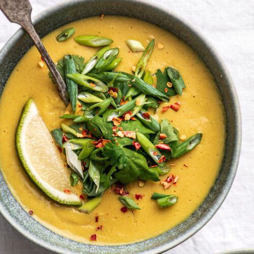 This Thai red lentil curry soup is filling and deep in flavor but also lightened up with fresh cilantro and lime juice. It pulls you in both directions.