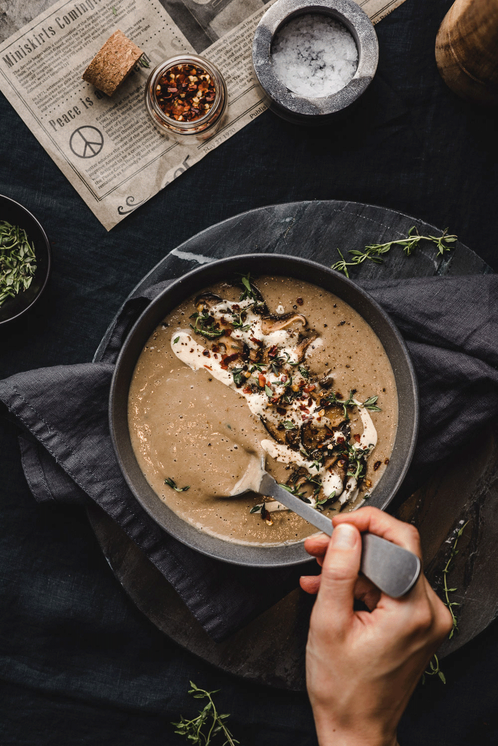 Maybe it’s the food I’ve been eating in Taipei, but my spice tolerance has increased significantly! I’ve added some heat to this cream of mushroom soup with red pepper flake – adjust to your liking!