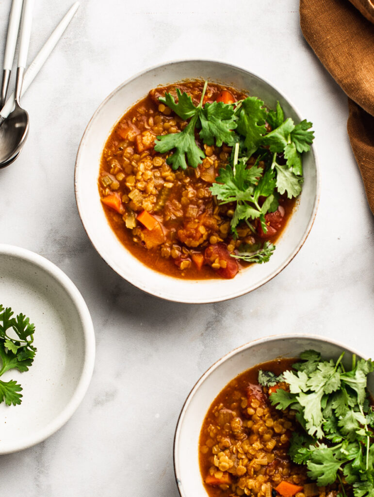 I love this vegan Moroccan lentil soup because it’s thickened with protein-rich red lentils, has anti-inflammatory and immune-boosting turmeric and ginger, and it takes about 30 minutes to make.