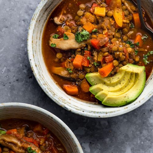 • Add the vegetable broth and tomatoes. Stir and partially cover and simmer for ~35 minutes or until the lentils are tender and the chili has thickened. Taste and re-season with salt and pepper. Divide among bowls and garnish with chopped avocado and/or cilantro (if using)