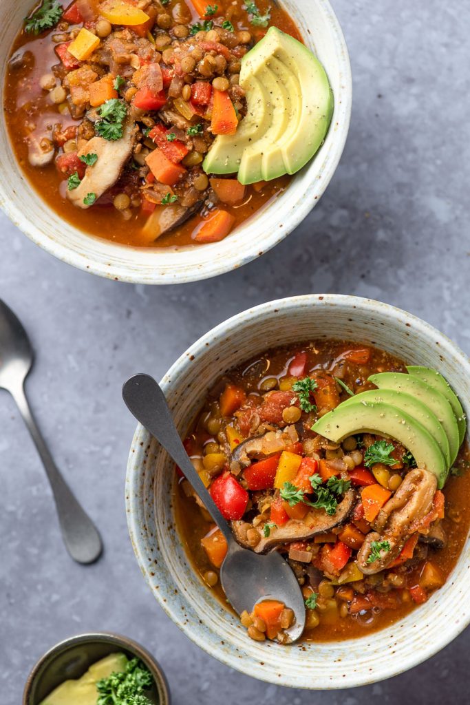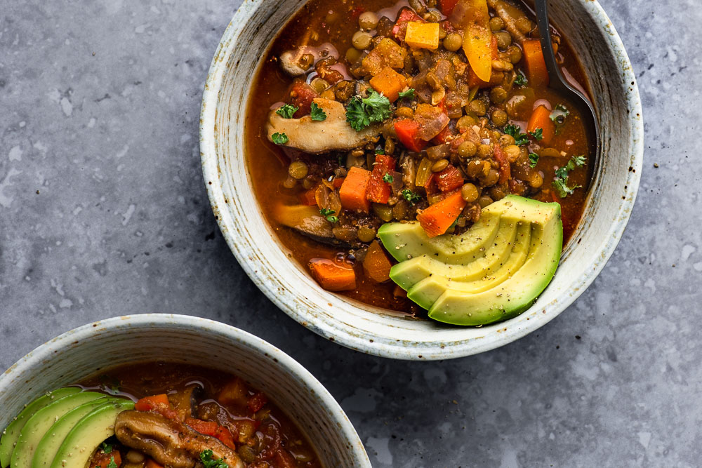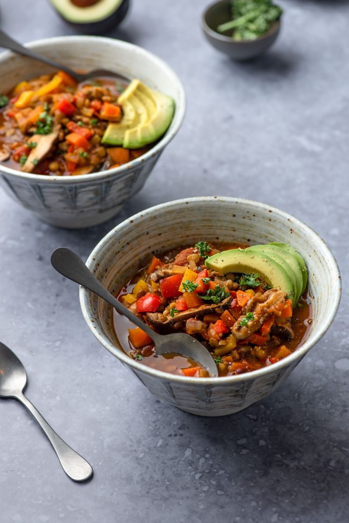 • Add the vegetable broth and tomatoes. Stir and partially cover and simmer for ~35 minutes or until the lentils are tender and the chili has thickened. Taste and re-season with salt and pepper. Divide among bowls and garnish with chopped avocado and/or cilantro (if using)